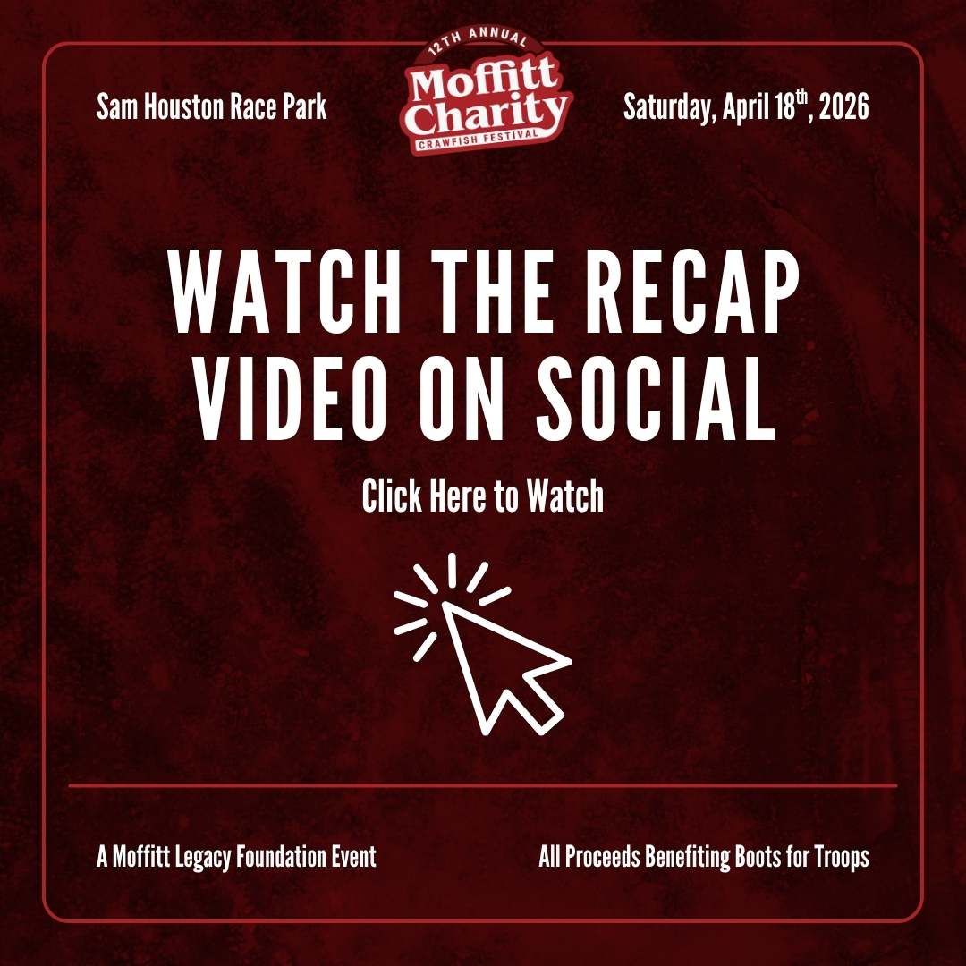 The Moffitt Legacy Foundation is going bigger and better this year to support Boots for Troops! Join us on April 18th, 2026 for great crawfish, an amazing concert lineup, and plenty of other suprises!
